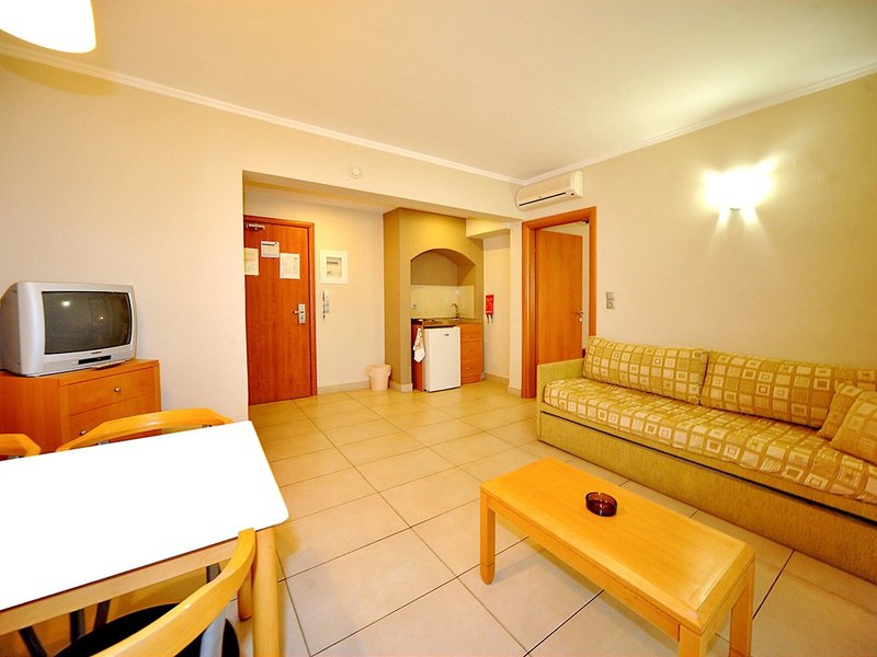 - 1-bedroom apartment (APX1), Appartement, im Hauptgebäude, Landseite, Poolblick, Landblick, ca. 35 - 36 m², letzte Komplettrenovierung 2017, Gesamtanzahl der Räume in diesem Zimmertyp: 2, Aufteilung wie folgt: kombiniertes Wohn-/Schlafzimmer, 1 Schlafzimmer, 2 Einzelbetten (90x190cm), 1 Schlafsofa (90x190cm), Babybett, Klimaanlage: pro Tag ca. 15 EUR, individuell regelbar, Heizung: individuell regelbar, Kochnische, Kühlschrank, Kochplatte, Kaffeemaschine, Kaffee-/Teezubereiter, Wasserkocher, Esstisch, Internet: WLAN/WiFi: ohne Gebühr, Fernseher: Flatscreen, im Wohnbereich, Sat-TV, Badewanne oder Dusche, Föhn, Balkon: mit Sitzgelegenheit