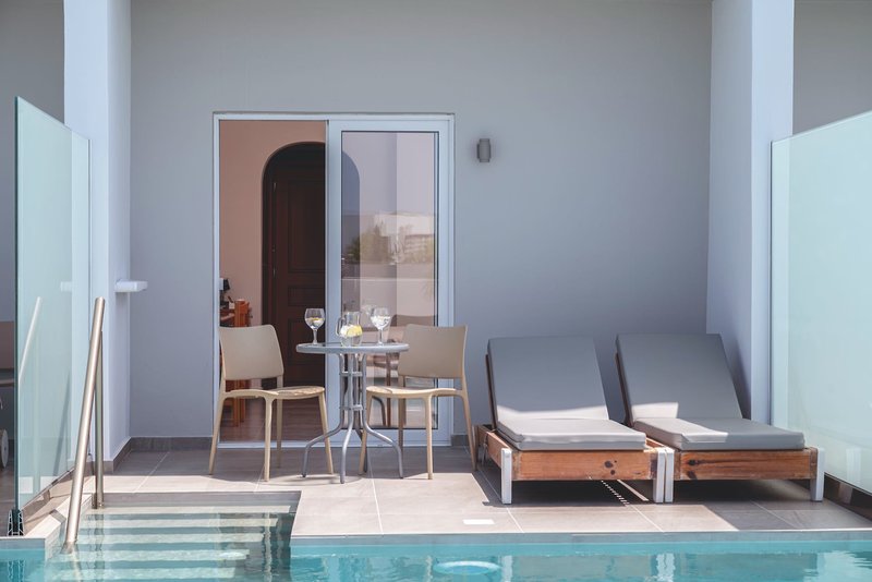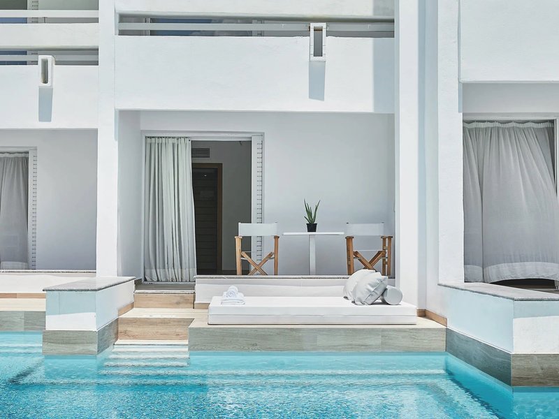 Die Doppelzimmer Superior Sharing Pool haben einen frisch renovierten Wohn-/Schlafraum. Die private Terrasse lädt mit einem Tisch und 2 Stühlen sowie Sonnenliegen zum Verweilen ein und verfügt über einen direkten Zugang zum Pool. Neben der gleichen Ausstattung wie die Doppelzimmer bieten sie zusätzlich Bademäntel und Slipper, einen Deckenventilator, eine Kaffee-/Tee-Ecke mit Espresso-Maschine (tägliche Auffüllung mit Kaffee, Tee und 4 Kaffee-Kapseln) und eine tägliche Auffüllung der Minibar mit je 2 Wasserflaschen, Softdrinks, Saft und Bier (P2H/2SH/OO2, buchbar ab 15 Jahren). Wahlweise zur Alleinbenutzung (P1H) buchbar.