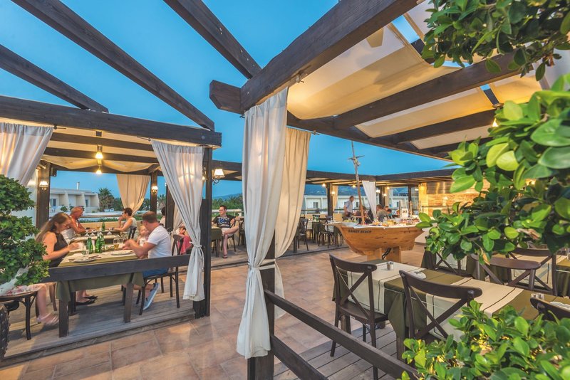 All Inclusive: Frühstück (7:30-10:30 Uhr) als reichhaltiges Buffet im Hauptrestaurant, Sonntags mit Sekt und Crêpes. Frühaufsteher-Frühstück (5-7 Uhr) als kontinentales Buffet auf Anfrage verfügbar. Mittagessen im Hauptrestaurant (12:30-14 Uhr) oder italienischen Restaurant (12:30-14:30 Uhr). Abendessen im Hauptrestaurant (18:30-21 Uhr) oder in der griechischen Taverne (18:30-21:30 Uhr, mit Anmeldung 24 h vorher, Getränke gegen Gebühr). Außerdem werden Hot Dogs und Eiscreme (14:30-17:30 Uhr) serviert. Getränke sind 10-23 Uhr inkludiert und beinhalten ausgewählte alkoholische und alkoholfreie Getränke wie Softdrinks, Säfte, Kaffee und Tee, lokale Weine und Fassbier sowie Spirituosen wie Ouzo, Brandy, Vodka, Gin, Tequila und Rum. Es werden glutenfreie Speisen angeboten (Anmeldung vor Ort an der Rezeption).