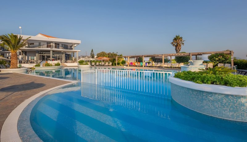 Ausstattung: Die wunderschöne und 2025 teilrenovierte Anlage (buchbar für Gäste ab 5 Jahren) hat 64 Zimmer, welche sich auf ein Haupthaus und und drei Nebengebäuden verteilen. Sie verfügt über einen Empfangsbereich mit Rezeption, eine Bar und ein Restaurant. Wi-Fi ist in der gesamten Anlage und am Strand verfügbar (inklusive). Im Außenbereich befindet sich ein Swimmingpool (10-18 Uhr) mit Sonnenterrasse und Poolbar. Liegen und Schirme sind am Pool inklusive, am Strand gegen Gebühr.