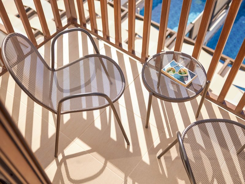 - Standard room side sea view (DZX2), Doppelzimmer, eingeschränkter Meerblick, ca. 25 m², letzte Komplettrenovierung 2024, Gesamtanzahl der Räume in diesem Zimmertyp: 1, Aufteilung wie folgt: 1 Schlafzimmer, Klimaanlage: individuell regelbar, Heizung: individuell regelbar, Fußboden: Fliesenboden, Safe: ohne Gebühr, Kaffee-/Teezubereiter, Minibar, Telefon, Internet: WLAN/WiFi: ohne Gebühr, Fernseher: im Schlafzimmer, Sat-TV, Radio, Roomservice: gegen Gebühr, Reinigungsservice: täglich, Dusche, WC, Bademantel: ohne Gebühr, Slipper: ohne Gebühr, Föhn, Balkon oder Terrasse: mit Sitzgelegenheit