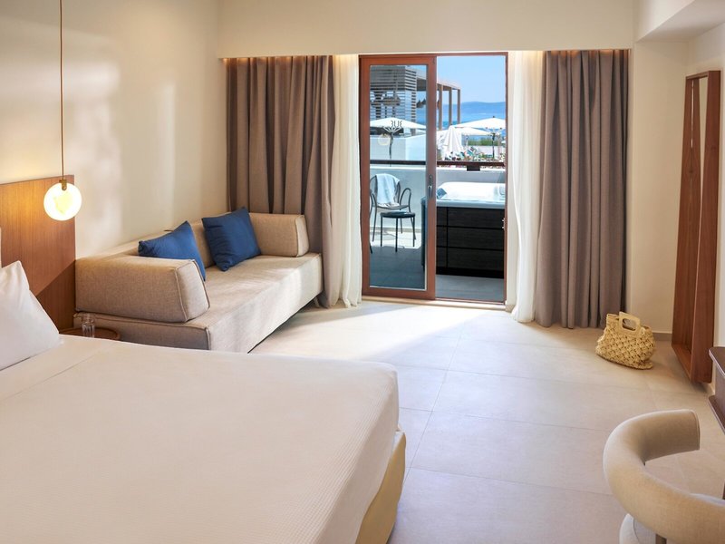 - Junior Suite sea view jacuzzi (JSM2), Juniorsuite, Meerblick, ca. 32 m², letzte Komplettrenovierung 2024, Gesamtanzahl der Räume in diesem Zimmertyp: 1, Aufteilung wie folgt: kombiniertes Wohn-/Schlafzimmer, 1 Schlafsofa, Klimaanlage: individuell regelbar, Heizung: individuell regelbar, Fußboden: Fliesenboden, Safe: ohne Gebühr, Sitzecke, Kaffee-/Teezubereiter, Minibar, Telefon, Internet: WLAN/WiFi: ohne Gebühr, Fernseher: im Schlafzimmer, Sat-TV, Radio, Roomservice: gegen Gebühr, Reinigungsservice: täglich, Dusche, WC, Bademantel: ohne Gebühr, Slipper: ohne Gebühr, Föhn, Balkon oder Terrasse: mit Whirlpool, mit Sitzgelegenheit