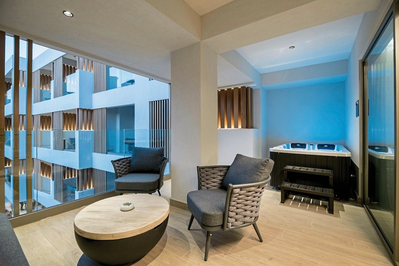 - 36-40 m2, junior suita, výhľad na more, kombinovaná obývacia izba/spálňa, 1 manželská posteľ (king size), 1 rozkladacia pohovka, 1 kúpeľňa, sprchovací kút, otvorený sprchovací kút, WC, župan, papuče, sušič vlasov, kozmetické zrkadlo , klimatizácia, minibar za poplatok, trezor, 1 TV (satelitná TV), espresso kávovar, káva/čaj, balkón (zariadený), vírivka, vankúšové menu, kvalitné toaletné potreby