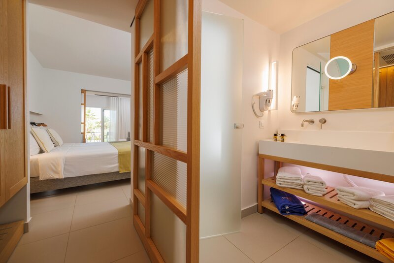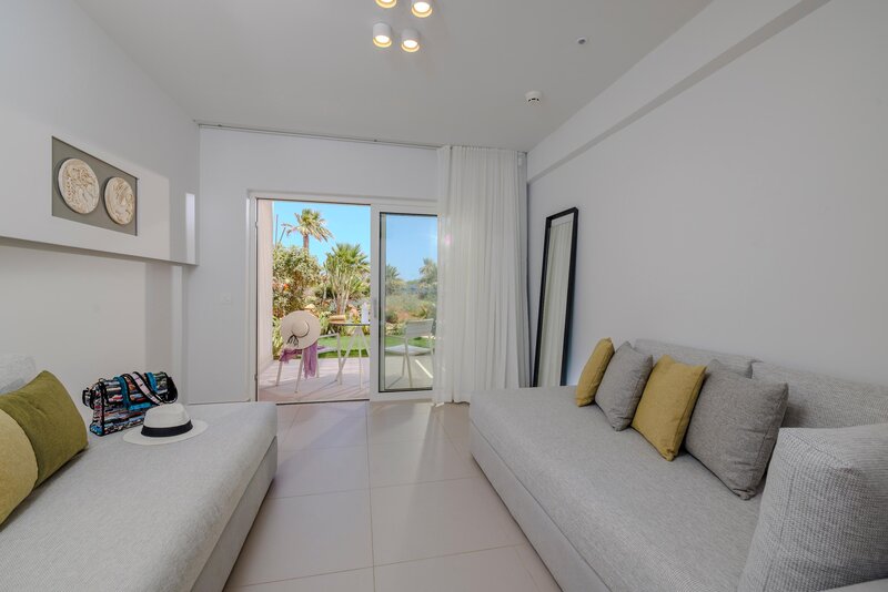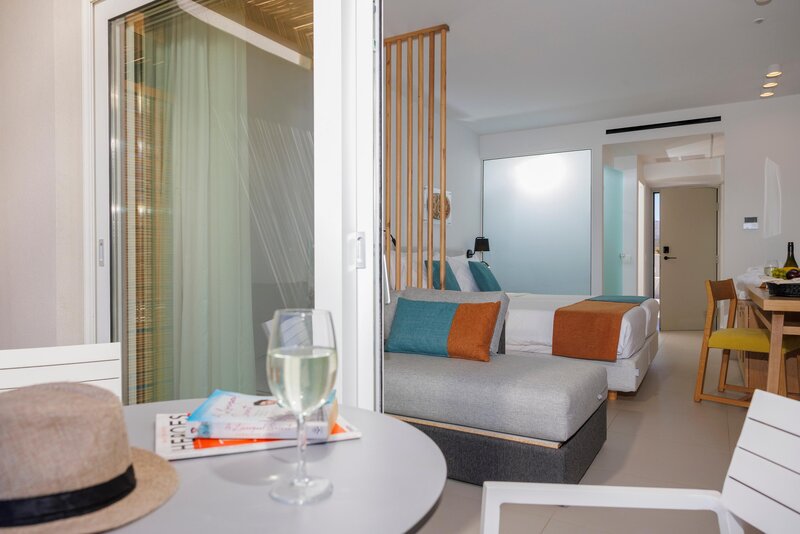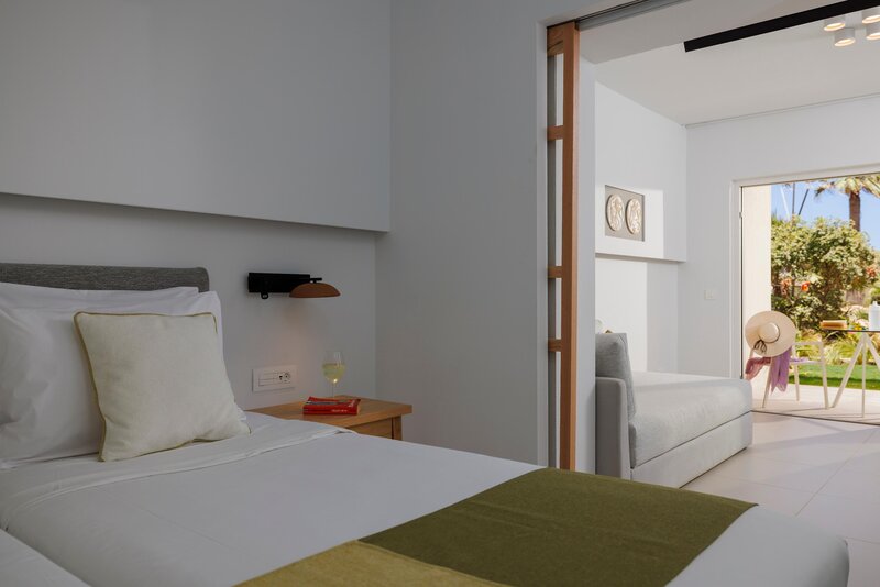 Apartmán (SUP, cca 31-37 m2; pod HER567), zrekonštruovaný, kombinovaná obývacia a spálňová časť, samostatná spálňa. Klimatizácia, minibar (dopĺňaný denne), TV, Wi-Fi, trezor na prenájom. Sprcha, WC, fén. Balkón/terasa s výhľadom do záhrady a súkromným bazénom. Max. 3 dospelí + 1 dieťa, rezervácia možná od 6 rokov.