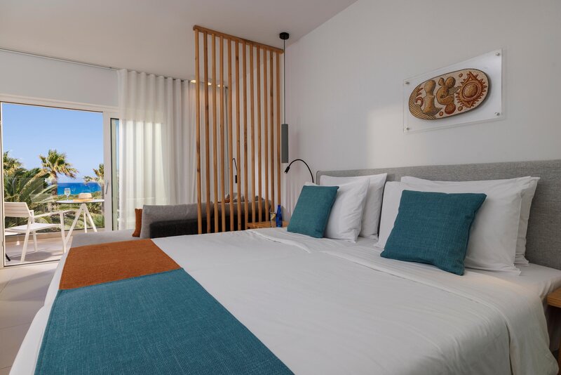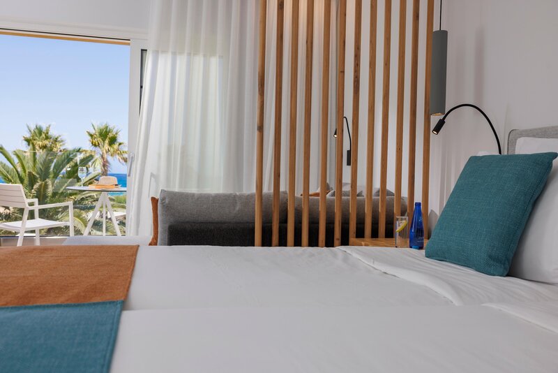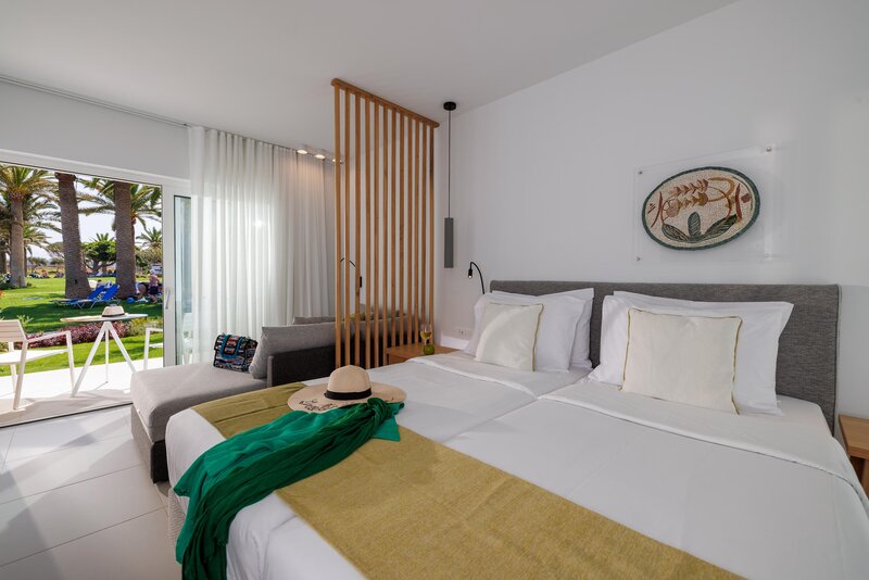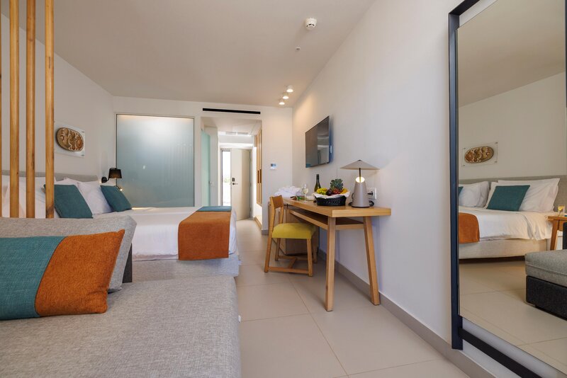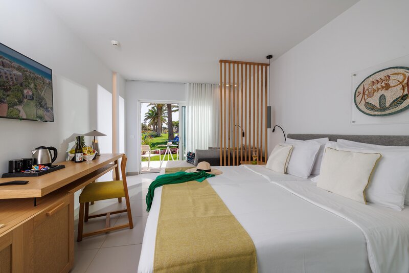 Rodinná izba (FZG, cca 28-32 m2; pod HER567, do 29.11.25), obývacia izba spojená so spálňou, samostatná spálňa. Klimatizácia, minibar (denne dopĺňaný), TV, Wi-Fi, trezor na prenájom. Kúpeľňa, WC, sušič vlasov. Balkón/terasa s výhľadom do záhrady, voliteľný výhľad na more (FZS). Max. 3 dospelí + 1 dieťa