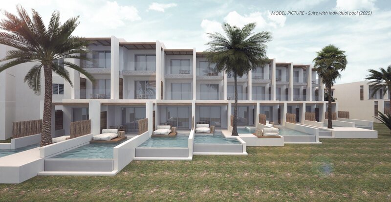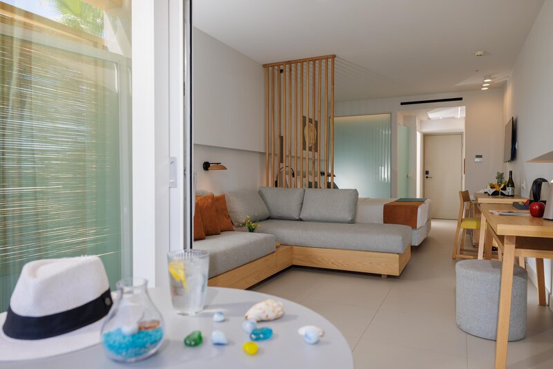 Suite (SUP, ca. 31-37 qm; unter HER567), renoviert, kombinierter Wohn- und Schlafbereich, sep. Schlafzimmer. Klima, Minibar (tägl. gefüllt), TV, WLAN, Mietsafe. Dusche, WC, Föhn. Balkon/Terrasse mit Gartenblick und privatem Pool. Max. 3E+1K, ab 6 Jahren buchbar.