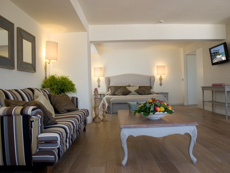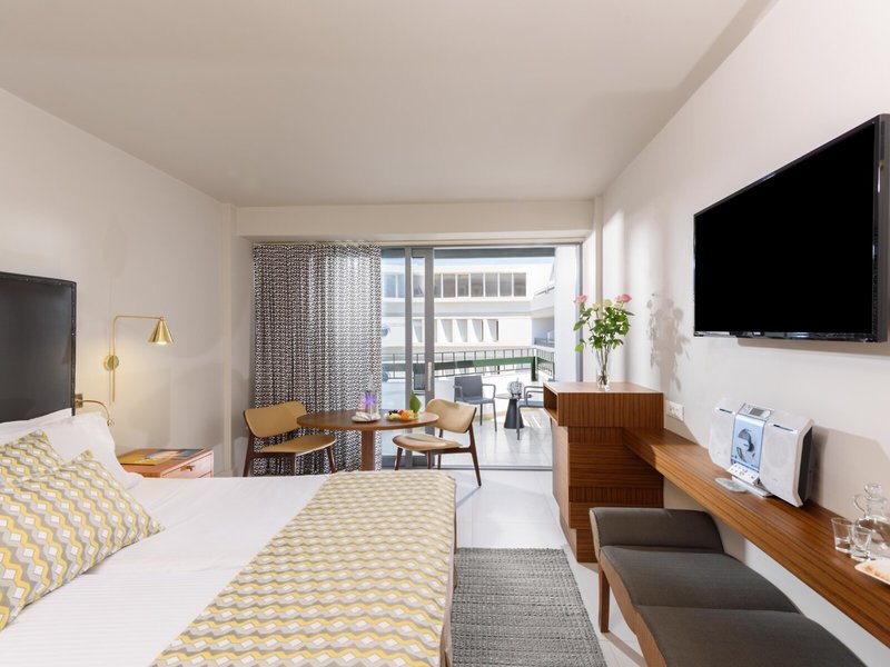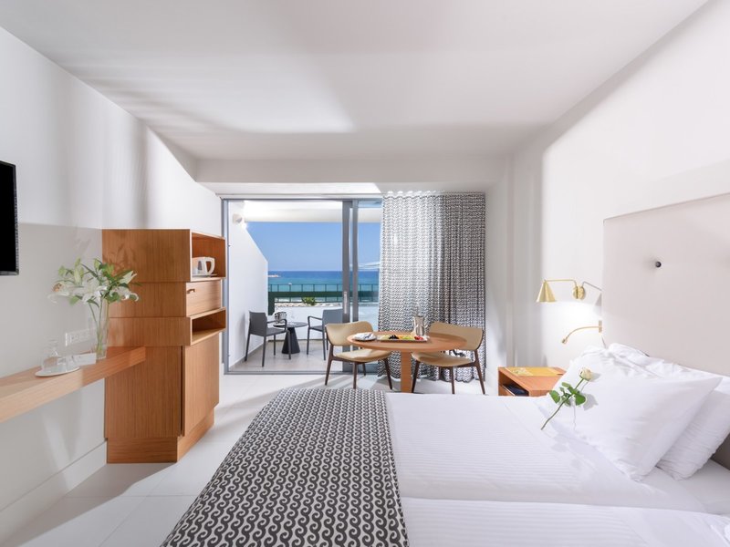 - Executive Junior Suite Sea View Mythica (JSM1), Juniorsuite, im Hauptgebäude, Meerseite, Meerblick, ca. 62 m², letzte Teilrenovierung 2017, Gesamtanzahl der Räume in diesem Zimmertyp: 1, Aufteilung wie folgt: kombiniertes Wohn-/Schlafzimmer, 1 King Size Bett (2x2cm), Klimaanlage: ohne Gebühr, individuell regelbar, kalt, warm, Fußboden: Fliesenboden, Safe: ohne Gebühr, Sofa, Kühlschrank: ohne Gebühr, Kaffee-/Teezubereiter, Wasserkocher, Esstisch, Minibar: gegen Gebühr, bei All Inclusive inklusive, Softdrinks: gegen Gebühr, bei All Inclusive inklusive, Wasser: gegen Gebühr, bei All Inclusive inklusive, alkoholische Getränke: gegen Gebühr, Snacks: gegen Gebühr, Minibarauffüllung: täglich, Telefon, Internet: WLAN/WiFi: ohne Gebühr, Fernseher: im Wohnbereich, deutsches Programm, DVD-Player, Radio, Roomservice: täglich 15:00 Uhr - 23:00 Uhr, gegen Gebühr, Reinigungsservice: ohne Gebühr, separate Dusche, Badewanne mit integriertem Whirlpool, WC, Bademantel: ohne Gebühr, Slipper: ohne Gebühr, Föhn, Balkon: mit Sitzgelegenheit, Terrasse: mit Liegestühlen