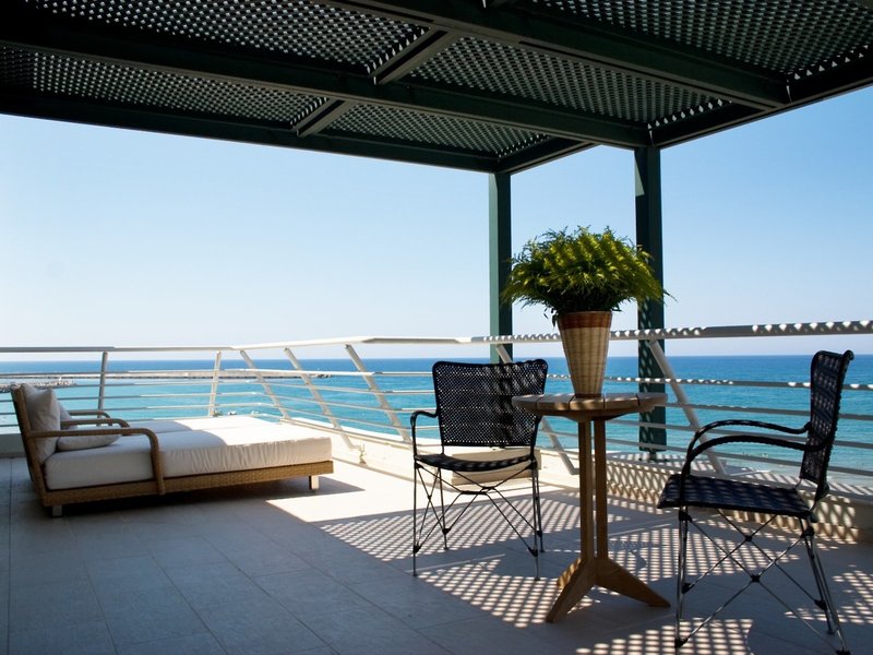 - Penthouse Suite Mythica (SUX1), Suite, im Hauptgebäude, Meerseite, Meerblick, ca. 68 m², Gesamtanzahl der Räume in diesem Zimmertyp: 1, Aufteilung wie folgt: kombiniertes Wohn-/Schlafzimmer, 1 King Size Bett (2x2cm), Klimaanlage: ohne Gebühr, individuell regelbar, kalt, warm, Fußboden: Parkett, Safe: ohne Gebühr, Sofa, Kühlschrank: ohne Gebühr, Kaffee-/Teezubereiter, Wasserkocher, Esstisch, Minibar: gegen Gebühr, bei All Inclusive inklusive, Softdrinks: gegen Gebühr, bei All Inclusive inklusive, Wasser: gegen Gebühr, bei All Inclusive inklusive, alkoholische Getränke: gegen Gebühr, Snacks: gegen Gebühr, Minibarauffüllung: täglich, Telefon, Internet: WLAN/WiFi: ohne Gebühr, Fernseher: im Wohnbereich, deutsches Programm, Sat-TV, DVD-Player, Radio, Roomservice: täglich 15:00 Uhr - 23:00 Uhr, gegen Gebühr, Reinigungsservice: ohne Gebühr, Dusche, Badewanne, WC, Bademantel: ohne Gebühr, Slipper: ohne Gebühr, Balkon: mit Sitzgelegenheit, Terrasse: mit Liegestühlen