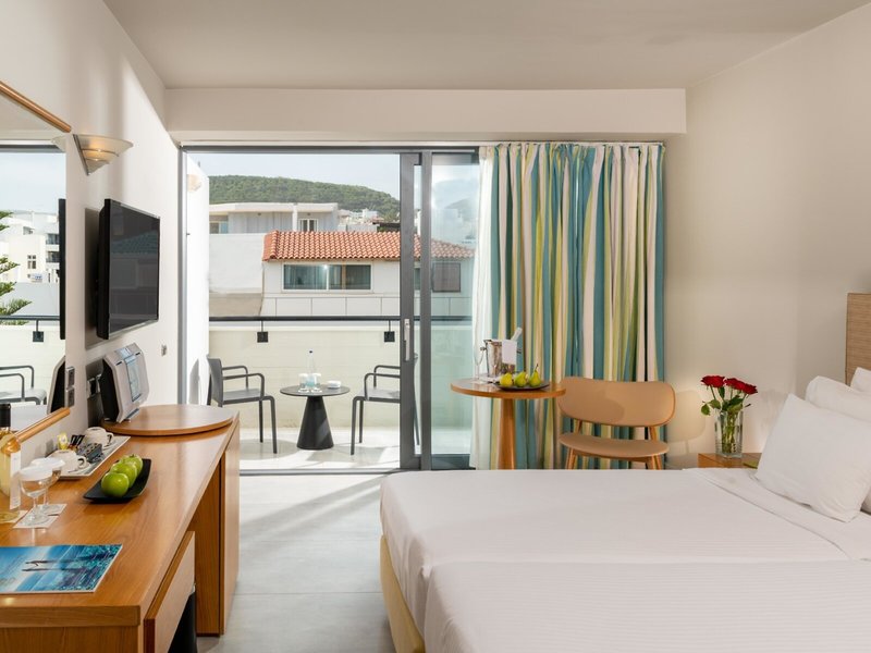 - Double deluxe sea front Mythica (DZM3), Doppelzimmer, im Hauptgebäude, Nordseite, Meerblick, ca. 27 m², letzte Teilrenovierung 2017, Gesamtanzahl der Räume in diesem Zimmertyp: 1, Aufteilung wie folgt: kombiniertes Wohn-/Schlafzimmer, 2 Einzelbetten (0,9x2cm), 1 Doppelbett, Klimaanlage: ohne Gebühr, individuell regelbar, kalt, warm, Fußboden: Fliesenboden, Safe: ohne Gebühr, Kühlschrank: ohne Gebühr, Kaffee-/Teezubereiter, Wasserkocher, Minibar: gegen Gebühr, bei All Inclusive inklusive, Softdrinks: gegen Gebühr, bei All Inclusive inklusive, Wasser: gegen Gebühr, bei All Inclusive inklusive, alkoholische Getränke: gegen Gebühr, bei All Inclusive inklusive, Snacks: gegen Gebühr, Minibarauffüllung: täglich, Telefon, Internet: WLAN/WiFi: ohne Gebühr, Fernseher: Flatscreen, deutsches Programm, Sat-TV, Radio, Roomservice: täglich 15:00 Uhr - 22:00 Uhr, gegen Gebühr, Reinigungsservice: ohne Gebühr, Badewanne oder Dusche, Whirlpool, WC, Bademantel: ohne Gebühr, Slipper: ohne Gebühr, Föhn, Balkon: mit Sitzgelegenheit