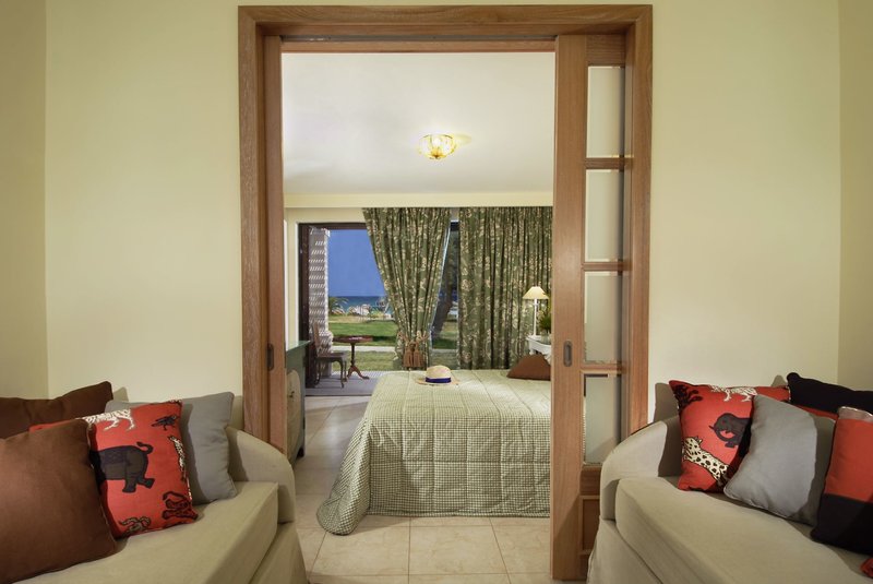 Deluxe Suite Meerblick 2 Schlafzimmer (Mythica): Die Suiten bestehen aus einem kombinierten Wohn-/Schlafraum, zwei separaten Schlafräumen und verfügen bei gleicher Ausstattung wie die Doppelzimmer zusätzlich über Meerblick, Strandtücher und -tasche, exklusive Pflegeprodukte, Espressomaschine, Bad/WC und einen Balkon mit Meerblick (SDM). Sie liegen im Hauptgebäude.