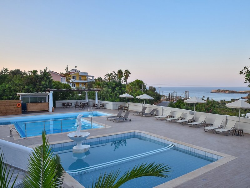Poloha a okolie Aparthotel sa nachádza na kopci nad morom a ponúka najkrajší výhľad na Stredozemné more a pohorie Talea. Pláž je vzdialená cca 200 m a do centra letoviska sa dostanete po cca 800 m. Autobusová doprava medzi Heraklionom a Rethymnom premáva každých 30 minút. Autobusová zastávka je cca 150 m od apartmánového hotela. K dispozícii je aj rezortný vláčik, ktorý vozí dovolenkárov na dôležité miesta v obci a do najbližšieho mesta Panormo. V pešej vzdialenosti sú pláže, obchody, bary, reštaurácie, zdravotné stredisko a lekáreň.