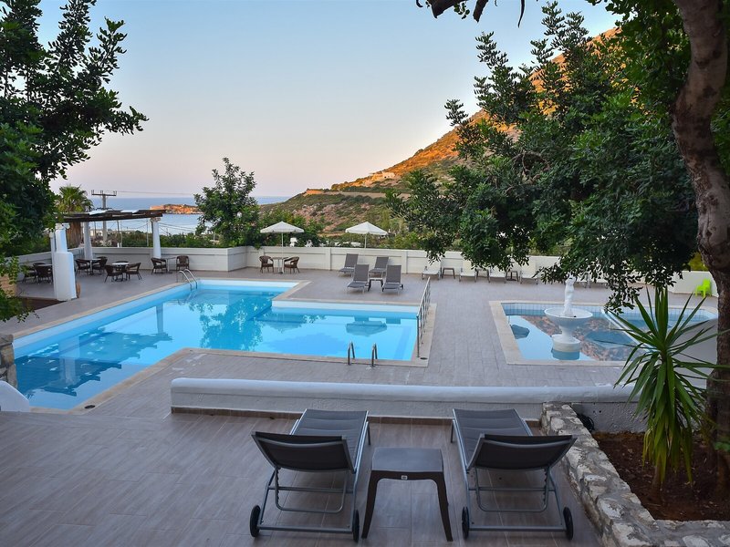 Lage & Umgebung Das Aparthotel befindet sich auf einem Hügel über dem Meer und bietet die wunderbarsten Ausblicke auf das Mittelmeer und die Talea-Berge. In ca. 200 m Entfernung gibt es einen Strand und das Zentrum des Urlaubsortes lässt sich nach rund 800 m erreichen. Ein Busservice verkehrt alle 30 min zwischen Heraklion und Rethymno. Eine Bushaltestelle liegt ca. 150 m vom Aparthotel entfernt. Es gibt auch einen Resort-Zug, der die Urlauber zu wichtigen Orten im Dorf und zum nächsten Ort Panormo bringt. In Gehweite befinden sich Strände, Einkaufsmöglichkeiten, Bars, Restaurants, das medizinische Zentrum und eine Apotheke.