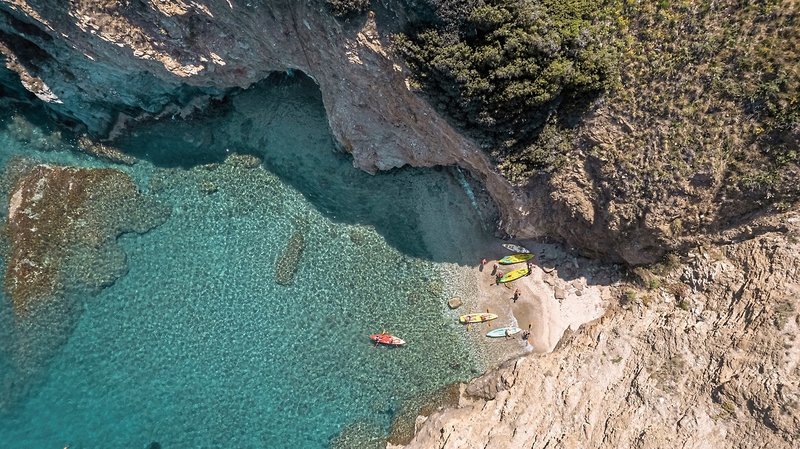 - Piesočnatá pláž: prístupná po schodoch, slnečníky, ležadlá