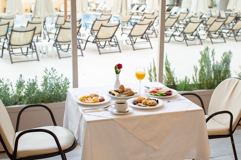 All inclusive: Frühstücksbuffet von 7:30-10:30 Uhr, Mittagessen in Buffetform (13-15 Uhr) und Abendessen (18:15-21:15 Uhr) in Buffetform. Während der Mahlzeiten (Mittag- und Abendessen) können die Gäste unbegrenzt Hauswein, Fassbier, Softdrinks und Wasser genießen. Zudem gibt es Snacks und Kuchen an der Hotelbar von 10-12 Uhr und von 15-16 Uhr. Nachmittags ebenfalls Eis von 15-16 Uhr. In der Zeit von 10-23 Uhr sind alkoholfreie Getränke wie Softdrinks, Wasser, Säfte, Kaffee (griechischer Kaffee, Filterkaffee, Eiskaffee, Espresso, Cappuccino) sowie alkoholische Getränke wie Fassbier, Hauswein (rot, weiß und rose), lokale Spirituosen (Raki, Brandy, Ouzo) und internationale Drinks (Vodka, Gin, Rum, Tequila, Whiskey, Vermouth, Aperitifs, Liköre, Long Drinks, ausgewählte Cocktails) an der Bar inkludiert. Es wird im Restaurant um angemessene Kleidung gebeten.