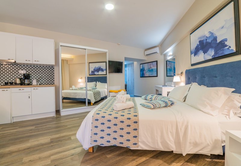 Studio Superior: Die geschmackvoll eingerichteten Zimmer verfügen über Dusche/WC, Föhn, Pflegeprodukte, Bademäntel und Slipper, Safe, individuell regulierbare Klimaanlage, Sat.-TV, Telefon (gegen Gebühr), Wi-Fi, kombinierten Wohn-/Schlafraum mit Kitchenette (Kühlschrank, Herdplatten, Mikrowelle, Kaffeemaschine, Wasserkocher, Toaster), Kaffee-/Teestation (wird täglich aufgefüllt), sowie Balkon oder Terrasse. Bei Ankunft eine Flasche Wasser, eine Flasche Wein und Früchte (U2S).