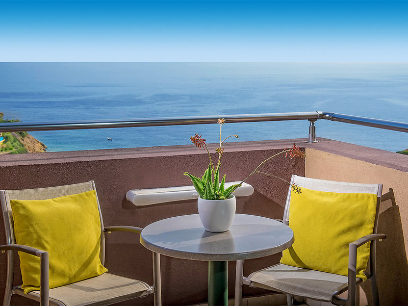Doppelzimmer (DZM, ca. 19-26 qm), im Hauptgebäude, Klimaanlage, Minikühlschrank, TV, Telefon, Mietsafe. Bad/Dusche, WC, Föhn. Balkon/Terrasse, Meerblick. Max. 2E