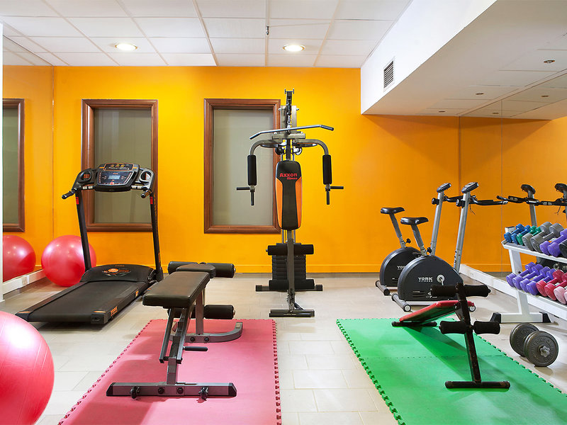Fitnessraum mit Laufmaschine, Fahrrädern, Trainingsbank, Armgewichtsmaschine und Gewichten
