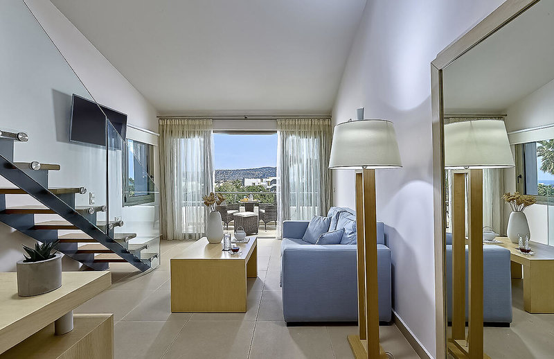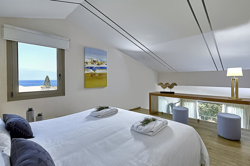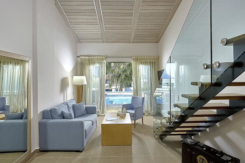 - 46-50 qm, Maisonette, 2 Etagen, Gartenblick, Doppelbett (Kingsize), Sofabett, 1 Bad, Dusche, Regendusche, bodengleiche Dusche, WC, Bademantel, Badeslipper, Haartrockner, Kosmetikspiegel, Klimaanlage, Minibar kostenpflichtig, Safe, TV (Sat-TV), Kaffee/Tee, Terrasse (möbliert), direkter Poolzugang, Privatpool, hochwertige Badartikel
