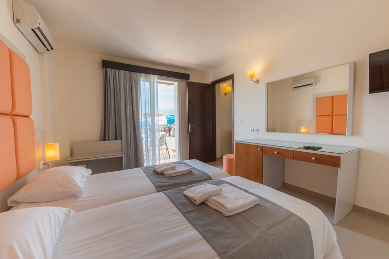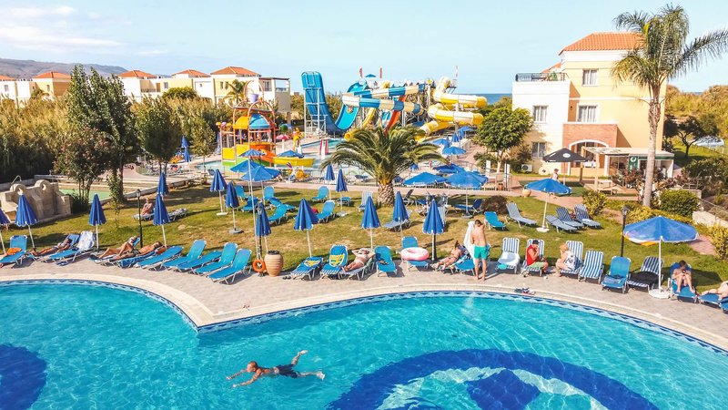 Zur Ausstattung der Anlage gehören eine 24-Stunden-Rezeption, Lobby, Lounge, ein Hauptrestaurant mit Show-Cooking (kretische und mediterrane Küche), die Taverne "Kipos" (À-la-carte, gegen Aufpreis, geöffnet ab Mai), Sat.-TV-Bereich, Minimarkt sowie kostenfreies Wi-Fi in der gesamten Hotelanlage.