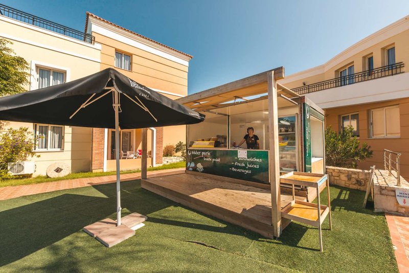 vybaveniu rezortu patrí 24-hodinová recepcia, vstupná hala, salónik, hlavná reštaurácia s prípravou jedál pred očami (krétska a stredomorská kuchyňa), taverna „Kipos“ (à la carte, za príplatok, otvorenie v máji), satelitná TV zóna, minimarket, bezplatné Wi-Fi vo verejných priestoroch a amfiteáter. Vonku je slnečná terasa, vonkajšie sprchy, bar pri bazéne, tri vonkajšie bazény (otvorené od 9:00 do 20:00) a aquapark so siedmimi toboganmi (otvorený od 10:00 do 18:00). Lehátka a slnečníky sú k dispozícii pri bazéne bezplatne; na verejnej pláži sú k dispozícii za poplatok. Osušky k bazénu a plážové osušky sú k dispozícii za poplatok a zálohu.