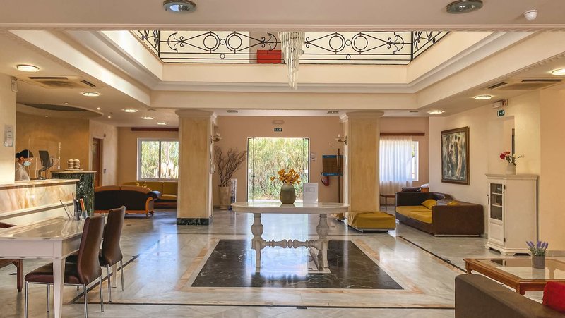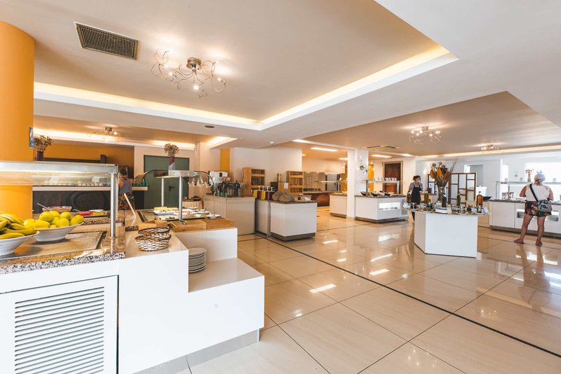 Zu den Annehmlichkeiten der Anlage gehören eine 24-Stunden-Rezeption, Lobby, Lounge, ein Hauptrestaurant mit Show Cooking (kretische und mediterrane Küche), Taverne "Kipos" (à la carte, gegen Aufpreis, öffnet ab Mai), Sat.-TV-Bereich, Minimarkt, Wi-Fi in öffentlichen Bereichen (inklusive) und ein Amphitheater. In der Außenanlage befinden sich eine Sonnenterrasse, Außenduschen, Poolbar, 3 Außenpools (9-20 Uhr) und ein Wasserpark mit 7 Wasserrutschen (10-18 Uhr). Liegen und Sonnenschirme sind am Pool inklusive, am öffentlichen Strand gegen Gebühr. Pool-/Strandtücher sind gegen Gebühr und Kaution erhältlich.