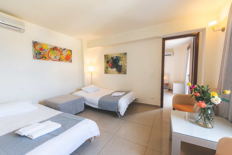 Familienzimmer Superior: Die Familienzimmer bestehen aus einem Schlafzimmer mit einem Doppelbett und einem kombinierten Wohn-/Schlafraum mit einem Twin Bett. Zusätzlich zur Standardausstattung enthalten diese Zimmer Pflegeprodukte (F2U).