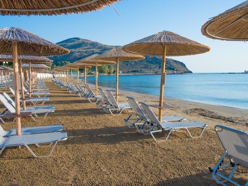 - Strand „Georgioupolis beach“: Sand, Liegestühle, Sonnenschirme