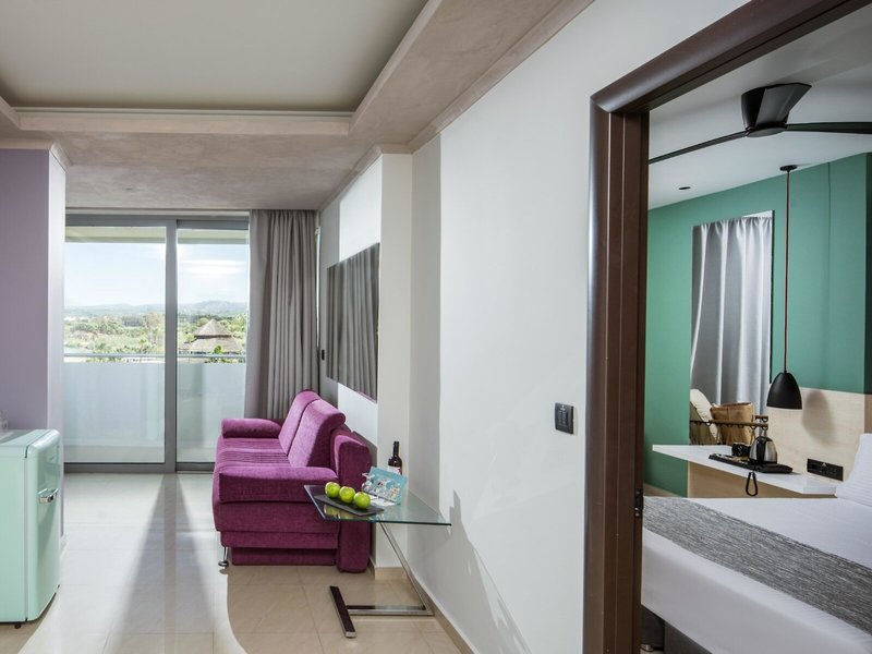 - Suite (SUX1), Juniorsuite, Nichtraucherzimmer, im Hauptgebäude, Meerseite, Meerblick, seitlicher Meerblick, letzte Komplettrenovierung 2022, letzte Teilrenovierung 2023, Gesamtanzahl der Räume in diesem Zimmertyp: 2, Aufteilung wie folgt: kombiniertes Wohn-/Schlafzimmer, 1 Schlafzimmer, 1 Doppelbett, 1 Schlafsofa, Babybett: ohne Gebühr, Reservierung notwendig, Moskitonetz, Klimaanlage: ohne Gebühr, zentral gesteuert, kalt, warm, Fußboden: Fliesenboden, Safe: ohne Gebühr, Deckenventilator, Sofa, Kühlschrank: ohne Gebühr, Kaffee-/Teezubereiter, Wasserkocher, Minibar: Wasser: ohne Gebühr, Minibarauffüllung: täglich, Telefon, Internet: WLAN/WiFi: ohne Gebühr, Fernseher: Flatscreen, im Schlafzimmer, im Kinderzimmer, deutsches Programm, Sat-TV, Roomservice: täglich 12:00 Uhr - 00:00 Uhr, gegen Gebühr, Reinigungsservice: täglich, ohne Gebühr, Dusche, WC, Bademantel, Slipper, Föhn, Kosmetikspiegel, Balkon: mit Sitzgelegenheit