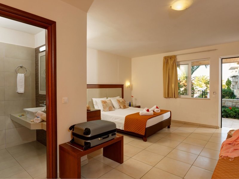 - Štvorlôžková izba s oddelenou spálňou a bočným výhľadom na more (DZX3), Rodinná izba, Minimálny vek v izbe: 13 rokov, v hlavnej budove, strana s bazénom, čiastočný výhľad na more, výhľad na bazén, cca 28 m², posledná čiastočná rekonštrukcia 2018, celkový počet izieb tohto typu: 1, rozloženie: pozostáva z 2 dvojlôžkových izieb so spojovacími dverami, 2 jednolôžka (80x200cm), 1 manželská posteľ (140x200cm), kúrenie: individuálne ovládané, podlaha: dlažba, chladnička, TV: plochá obrazovka, upratovacia služba: Po - So, sprcha, WC, fén, balkón alebo terasa: s posedením