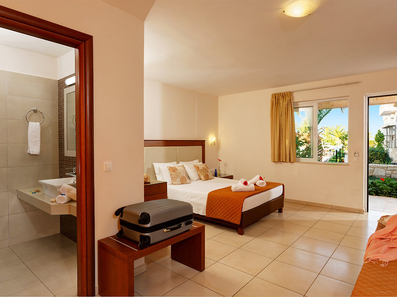 Familienzimmer (FZ, ca. 28 qm), sep. Schlafbereich, Klimaanlage, Minikühlschrank, WLAN, TV. Dusche, WC, Föhn. Terrasse mit seitl. Meerblick. Max. 4E