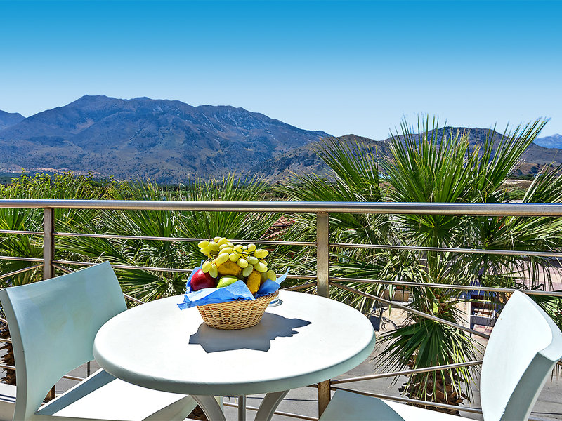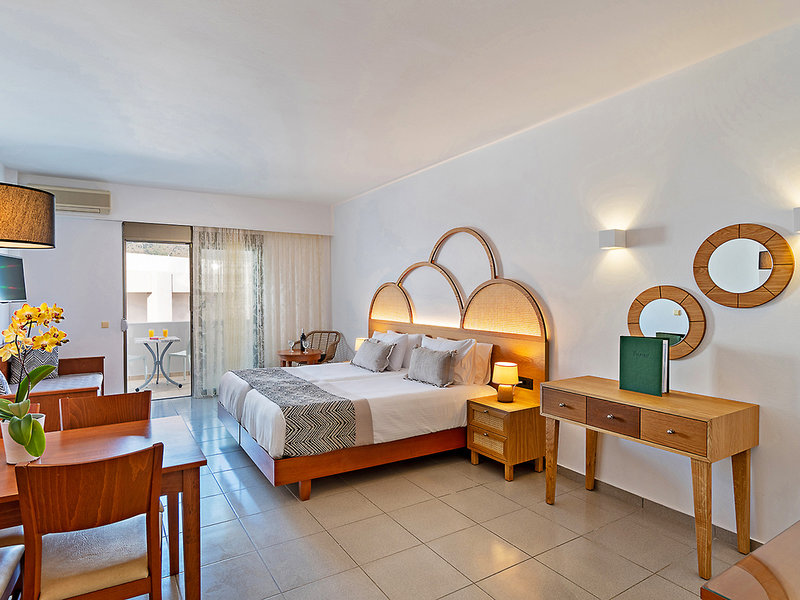 Juniorsuiten (JS, ca. 35 qm), separates Schlafzimmer, Klimaanlage, Kühlschrank, TV, Telefon, Mietsafe, Bad oder Dusche, Föhn, Balkon oder Terrasse, Landblick. Max. 3E+1K