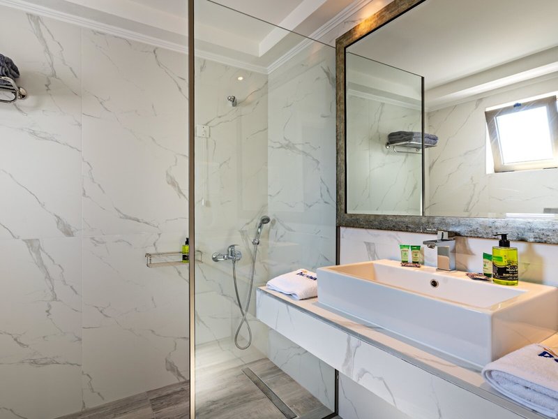 - Junior Suite (JSX1), Junior Suite, Nefajčiarska izba, Do záhrady, Do ulice, Výhľad na hory, Výhľad do záhrady, Výhľad na hory (Lefka Ori), cca 36 m², naposledy čiastočne zrekonštruovaná v roku 2021, Celkový počet izieb v tomto type izby: 1, Rozloženie: Obývacia izba, 1 spálňa, 2 jednolôžka, 1 manželská posteľ (160 cm), 1 rozkladacia pohovka (70 x 190 cm), Detská postieľka: bezplatne, nie je potrebná žiadosť, Moskytiéra, Klimatizácia: bezplatne, individuálne ovládaná, studená, teplá, Podlaha: Dlažba, Trezor: za poplatok, Pohovka, Chladnička: bezplatne, Kávovar/čajník, Kanvica, Jedálenský stôl, Minibar: za poplatok, Doplnenie minibaru, Telefón, Internet: WLAN/WiFi, TV: Plochá obrazovka, v obývacej časti, Nemecké kanály, Satelitná TV, Upratovacia služba, Vaňa alebo sprchovací kút, WC, Župan: bezplatne, Papuče: bezplatne, Fén, Balkón alebo terasa: s posedením
