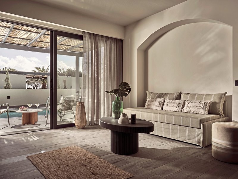 - Juniorsuite, Superior, Gartenblick, 1 separater Wohnraum, Sitzecke, Schreibtisch, Doppelbett, 1 Bad, Dusche, WC, Bademantel, Badeslipper, Haartrockner, Kosmetikspiegel, Klimaanlage, Heizung, Minibar kostenpflichtig, Safe, Bügelbrett, Bügeleisen, TV (Sat-TV, Flachbildschirm), Musikanlage, WLAN, Kaffeemaschine, Kaffee/Tee, Terrasse (möbliert), direkter Poolzugang, Privatpool, bei Ankunft im Zimmer Obstkorb, Wein