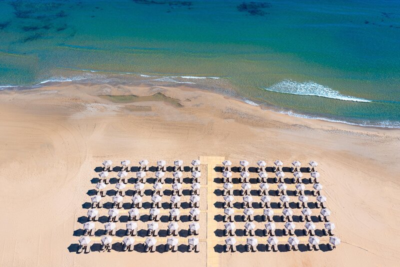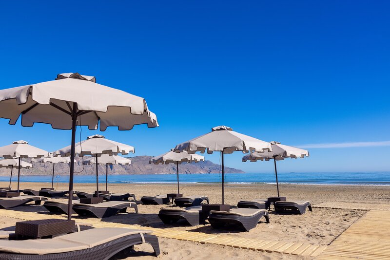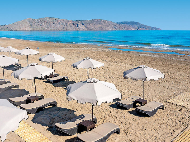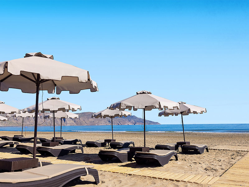 Lage: Das Hotel liegt direkt am traumhaften, flach abfallenden Sandstrand von Georgioupolis, der sich über 8 km erstreckt und perfekte Bedingungen für entspannte Spaziergänge bietet. In der Umgebung gibt es gemütliche Kafenions, Tavernen und kleine Geschäfte. Das malerische Ortszentrum von Georgioupolis ist etwa 4 km entfernt, der Weg entlang des Strandes dauert rund 45 Minuten. Eine Bushaltestelle befindet sich nur 50 m entfernt, und der Süßwassersee Kournas (ca. 5 km) sowie Rethymnon (ca. 20 km) sind leicht erreichbar.