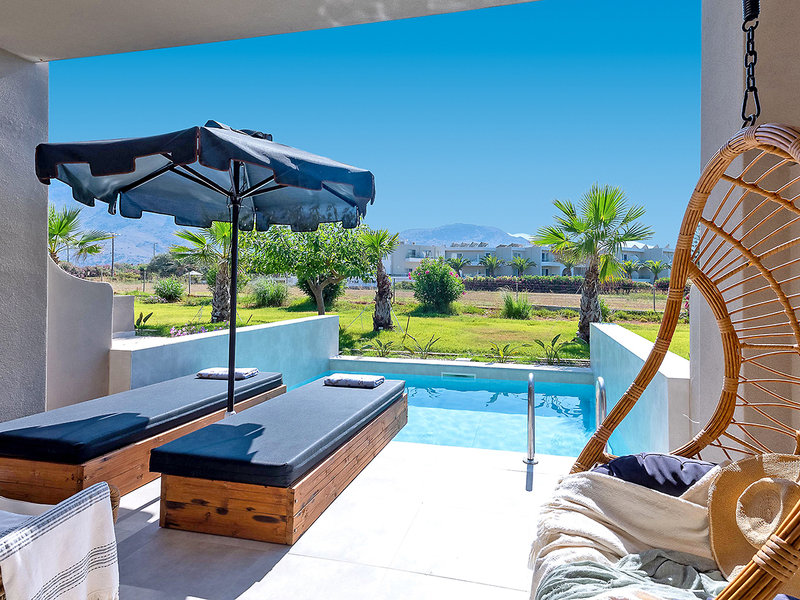 Superior-Doppelzimmer (DZP, ca. 25 qm), Klimaanlage, Minikühlschrank, Tee- und Kaffeezubereiter, TV, Telefon, Safe. Dusche, WC, Bademäntel, Slipper, Föhn. Balkon/Terrasse mit Privatpool. Max. 2E