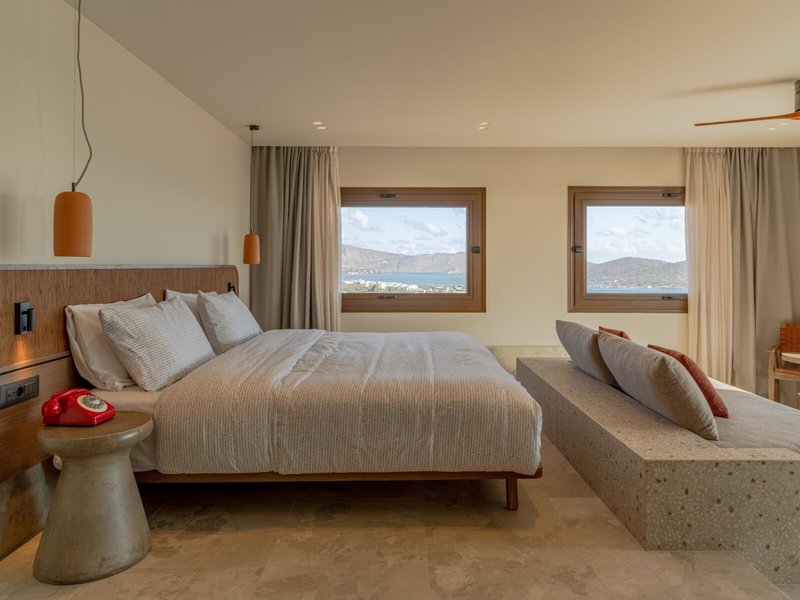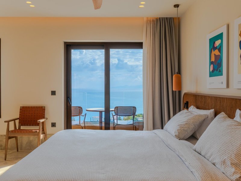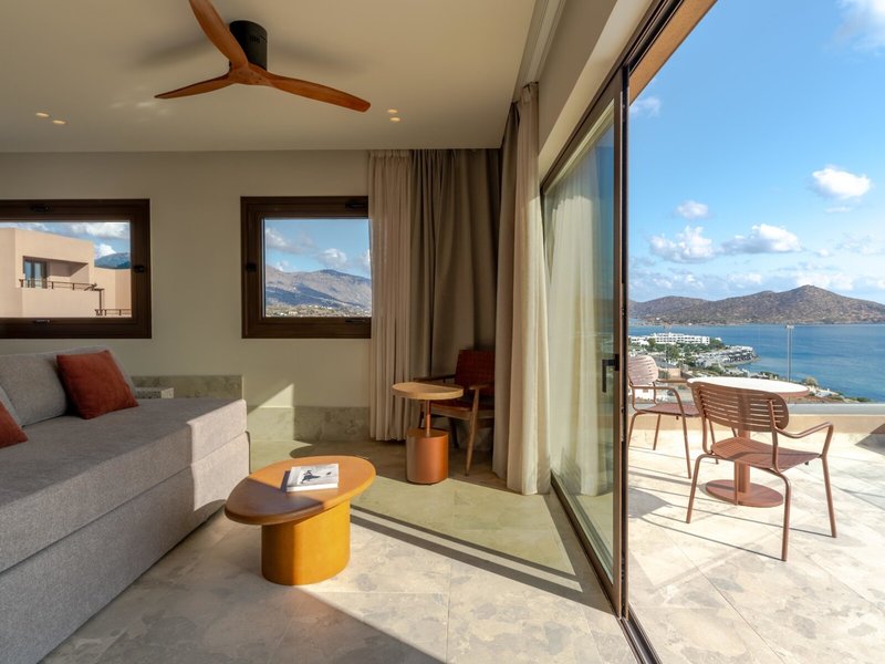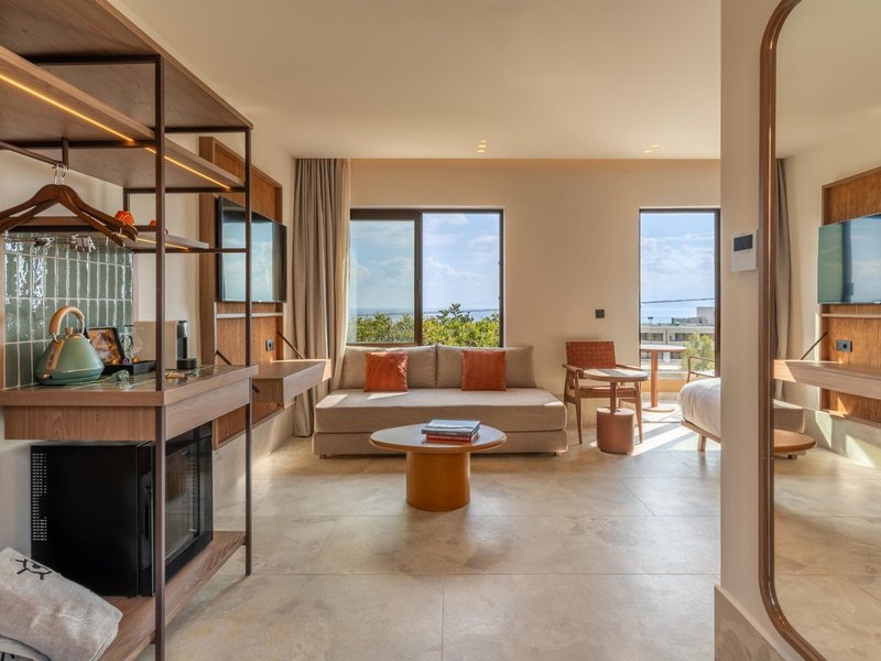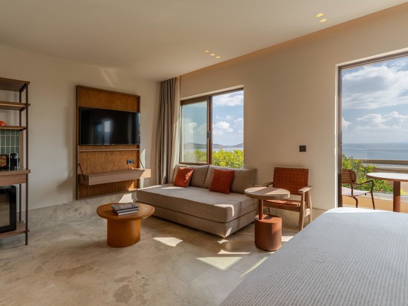 - Loft Sea View (FZM1), Dreibettzimmer, im Hauptgebäude, Meerblick, ca. 30 - 36 m², letzte Komplettrenovierung 2025, Gesamtanzahl der Räume in diesem Zimmertyp: 1, Aufteilung wie folgt: kombiniertes Wohn-/Schlafzimmer, 1 King Size Bett (200x200cm), 1 Schlafsofa (100x200cm), Klimaanlage: ohne Gebühr, individuell regelbar, kalt, warm, Heizung: individuell regelbar, Fußboden: Fliesenboden, Safe: ohne Gebühr, Deckenventilator, Sofa, Schreibtisch, Bügeleisen, Nespressomaschine, Kaffee-/Teezubereiter, Minibar: ohne Gebühr, Softdrinks: ohne Gebühr, Minibarauffüllung, Telefon, Fernseher: Flatscreen, im Schlafzimmer, Sat-TV, Dusche, Regendusche, separates WC, Bademantel: ohne Gebühr, Slipper: ohne Gebühr, Föhn, Balkon oder Terrasse: mit Sitzgelegenheit