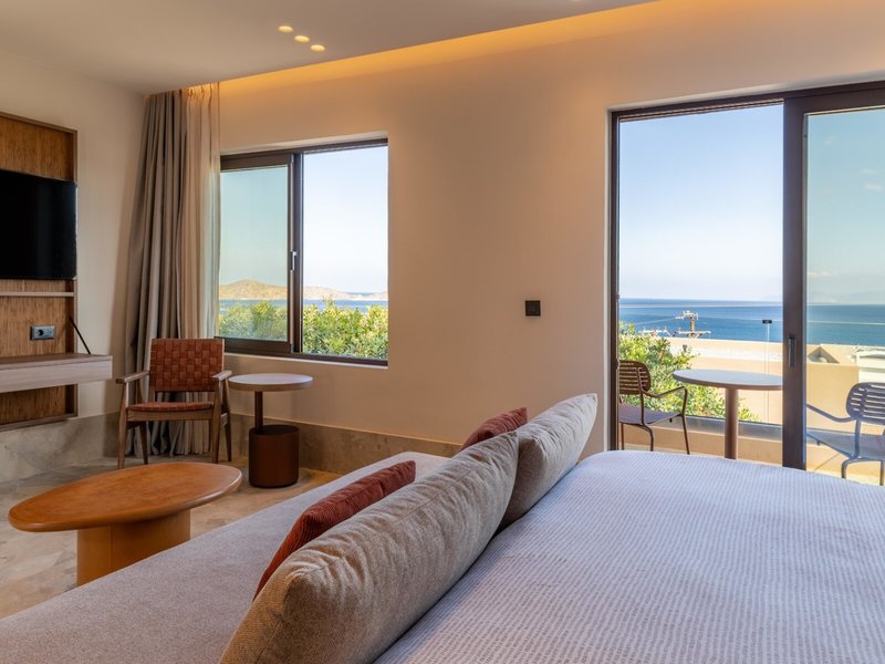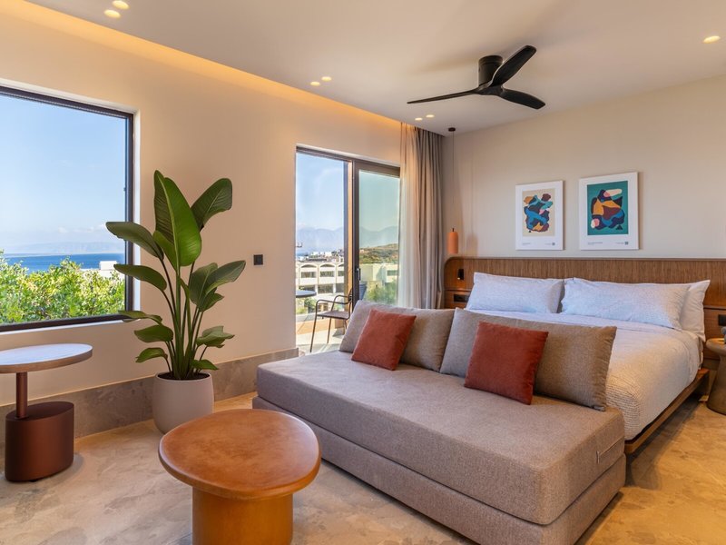 - Loft Sea View (FZM1), Dreibettzimmer, im Hauptgebäude, Meerblick, ca. 30 - 36 m², letzte Komplettrenovierung 2025, Gesamtanzahl der Räume in diesem Zimmertyp: 1, Aufteilung wie folgt: kombiniertes Wohn-/Schlafzimmer, 1 King Size Bett (200x200cm), 1 Schlafsofa (100x200cm), Klimaanlage: ohne Gebühr, individuell regelbar, kalt, warm, Heizung: individuell regelbar, Fußboden: Fliesenboden, Safe: ohne Gebühr, Deckenventilator, Sofa, Schreibtisch, Bügeleisen, Nespressomaschine, Kaffee-/Teezubereiter, Minibar: ohne Gebühr, Softdrinks: ohne Gebühr, Minibarauffüllung, Telefon, Fernseher: Flatscreen, im Schlafzimmer, Sat-TV, Dusche, Regendusche, separates WC, Bademantel: ohne Gebühr, Slipper: ohne Gebühr, Föhn, Balkon oder Terrasse: mit Sitzgelegenheit