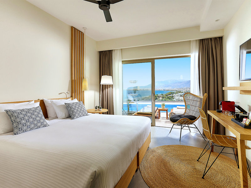 Doppelzimmer (DZP, ca. 18 qm), Klimaanlage, Minikühlschrank, Nespresso®-Kaffeemaschine (Kapseln täglich aufgefüllt), Kaffee-/Teezubereiter (täglich aufgefüllt), TV, WLAN, Safe. Dusche, WC, Föhn. Balkon/Terrasse mit privatem Pool. Max. 2E