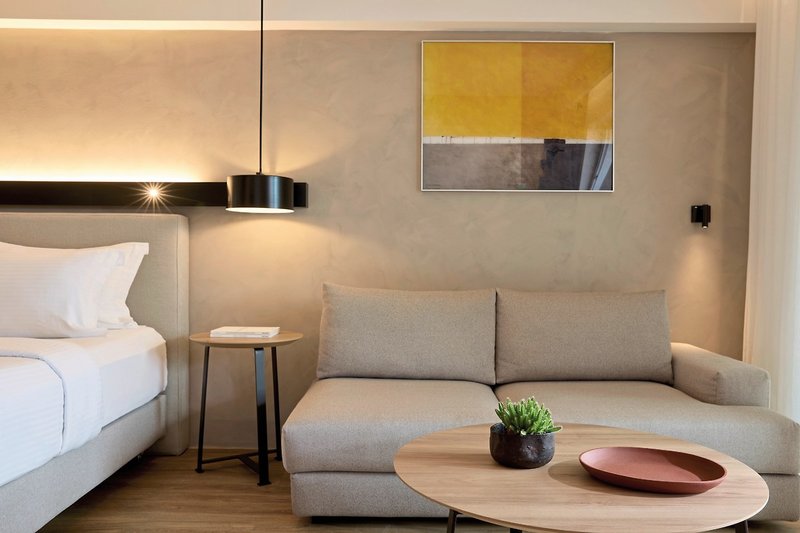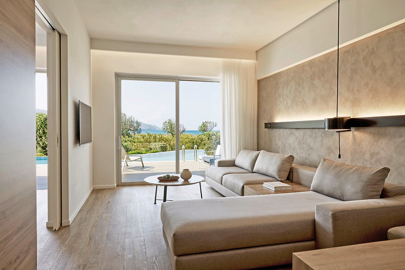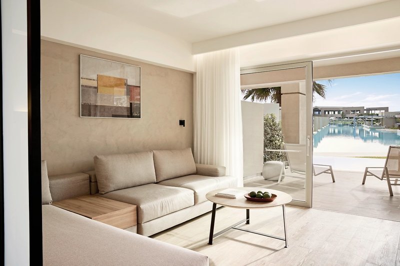 - 51-60 qm, Suite, 1 separates Schlafzimmer, 1 Doppelbett, 2 Sofabetten, 2 Bäder, Dusche, Badewanne, Bademantel, Badeslipper, Haartrockner, Klimaanlage, individuell regulierbar, Minibar, Auffüllung regelmäßig, 1xwöchentlich, Softdrinks, Säfte, Wasser, Safe, TV (Sat-TV), Kaffee/Tee, Terrasse (möbliert), direkter Poolzugang, Gemeinschaftspool, late check-out (nach Verfügbarkeit), hochwertige Badartikel, Aufdeck-Service, VIP-Frühstücksbuffet im Restaurant, „Kouzina“, 4 A-la-carte-Abendessen pro Woche (das 4. A-la-carte-Abendessen nur im Seafood Restaurant „Psari“ möglich), tägliche Auffüllung der Espresso-Kapseln, kostenloser Fahrradverleih (1xpro Aufenthalt/verfügbar an bestimmten Tagen, vorherige Reservierung erforderlich)