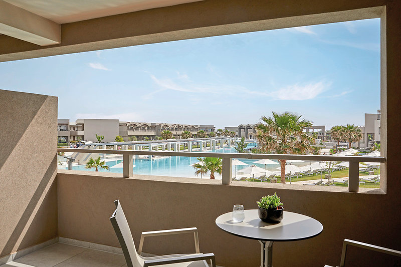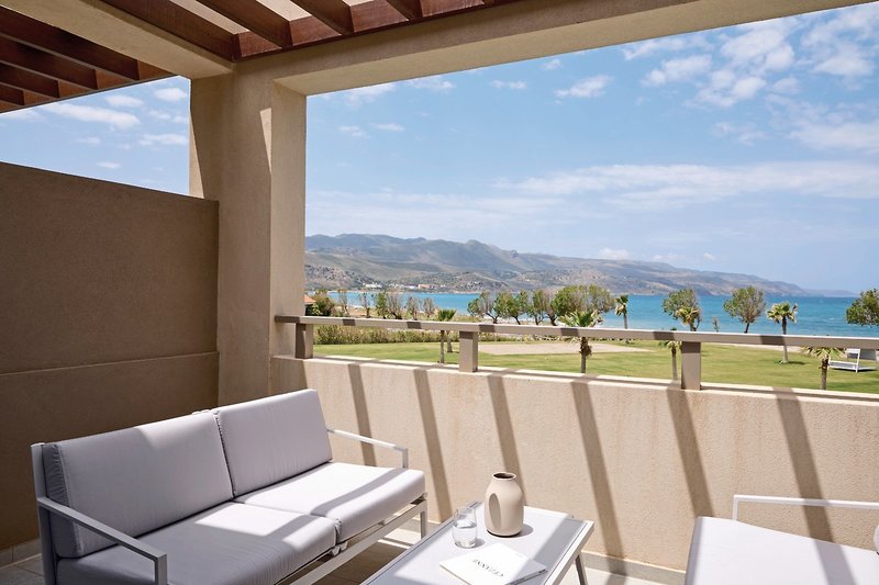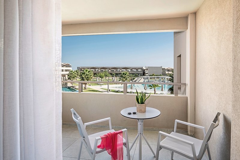 - 26-30 qm, Doppel, Meerblick (seitlich), Sofabett, Dusche, Bademantel, Badeslipper, Haartrockner, Klimaanlage, individuell regulierbar, Minibar, Auffüllung regelmäßig, 1xwöchentlich, Softdrinks, Säfte, Wasser, Safe, TV (Sat-TV), Kaffee/Tee, Terrasse (möbliert), direkter Poolzugang, Gemeinschaftspool, late check-out (nach Verfügbarkeit), hochwertige Badartikel, Aufdeck-Service, VIP-Frühstücksbuffet im Restaurant, „Kouzina“, 4 A-la-carte-Abendessen pro Woche (das 4. A-la-carte-Abendessen nur im Seafood Restaurant „Psari“ möglich), tägliche Auffüllung der Espresso-Kapseln, kostenloser Fahrradverleih (1xpro Aufenthalt/verfügbar an bestimmten Tagen, vorherige Reservierung erforderlich)