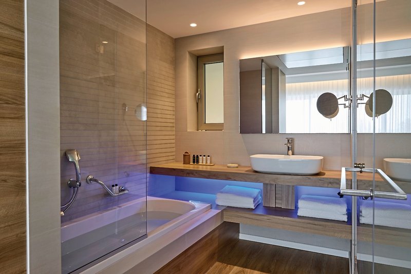 - 51-60 qm, Suite, Meerblick (seitlich), 1 separates Schlafzimmer, 1 Doppelbett, 2 Sofabetten, 2 Bäder, Dusche, Badewanne, Bademantel, Badeslipper, Haartrockner, Klimaanlage, individuell regulierbar, Minibar, Auffüllung regelmäßig, 1xwöchentlich, Softdrinks, Säfte, Wasser, Safe, TV (Sat-TV), Kaffee/Tee, Balkon oder Terrasse (möbliert), late check-out (nach Verfügbarkeit), hochwertige Badartikel, Aufdeck-Service, VIP-Frühstücksbuffet im Restaurant, „Kouzina“, 4 A-la-carte-Abendessen pro Woche (das 4. A-la-carte-Abendessen nur im Seafood Restaurant „Psari“ möglich), tägliche Auffüllung der Espresso-Kapseln, kostenloser Fahrradverleih (1xpro Aufenthalt/verfügbar an bestimmten Tagen, vorherige Reservierung erforderlich)