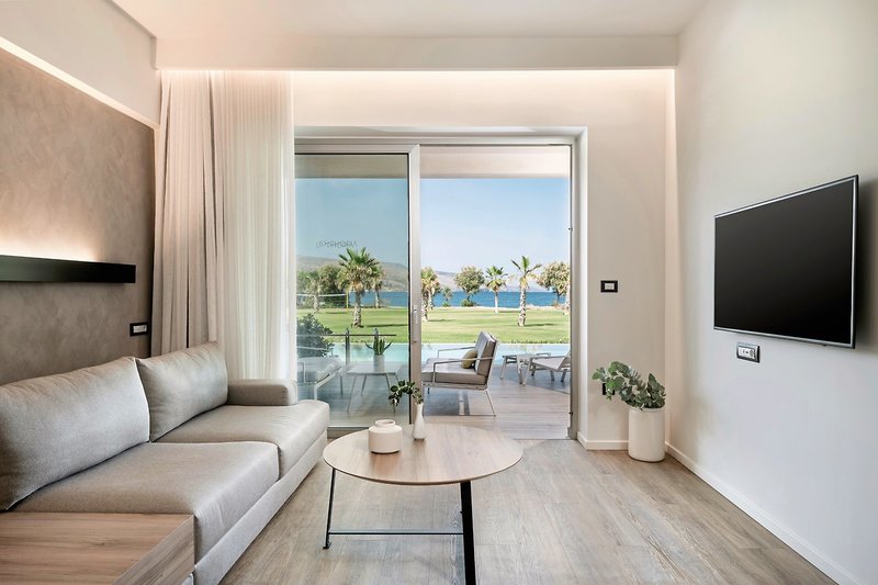 - 51-60 qm, Suite, Meerblick (seitlich), 1 separates Schlafzimmer, 1 Doppelbett, 2 Sofabetten, 2 Bäder, Dusche, Badewanne, Bademantel, Badeslipper, Haartrockner, Klimaanlage, individuell regulierbar, Minibar, Auffüllung regelmäßig, 1xwöchentlich, Softdrinks, Säfte, Wasser, Safe, TV (Sat-TV), Kaffee/Tee, Terrasse (möbliert), direkter Poolzugang, Gemeinschaftspool, late check-out (nach Verfügbarkeit), hochwertige Badartikel, Aufdeck-Service, VIP-Frühstücksbuffet im Restaurant, „Kouzina“, 4 A-la-carte-Abendessen pro Woche (das 4. A-la-carte-Abendessen nur im Seafood Restaurant „Psari“ möglich), Strandpavillon für den gesamten Aufenthalt, tägliche Auffüllung der Espresso-Kapseln, kostenloser Fahrradverleih (1xpro Aufenthalt/verfügbar an bestimmten Tagen, vorherige Reservierung erforderlich)
