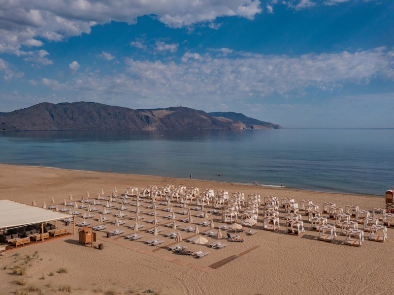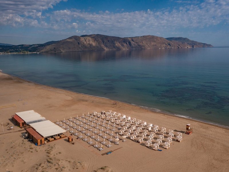 - Strand „Georgioupolis“: Sand, feinsandig, flach abfallend, Liegen, Liegestühle, Sonnenschirme