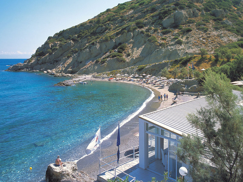 - Pláž: piesok, štrk, dĺžka pláže: cca 450 m, schody na pláž, záliv, verejná s vlastnou časťou hotela, ležadlá: zdarma, slnečníky: zdarma