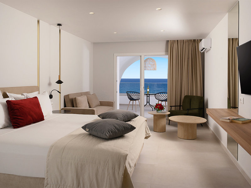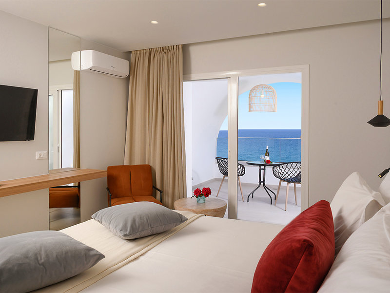 Superior-Doppelzimmer (DSP, ca. 18-23 qm), renoviert, Klimaanlage, Kühlschrank, WLAN, TV, Telefon, Mietsafe. Dusche, WC, Föhn. Balkon/Terrasse mit Meerblick. Max. 2E, wahlweise zur Dreierbelegung (DS3) buchbar. Max. 3E