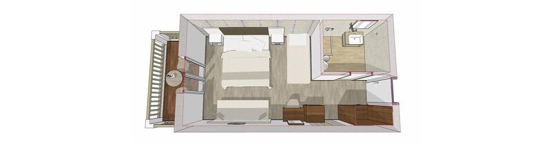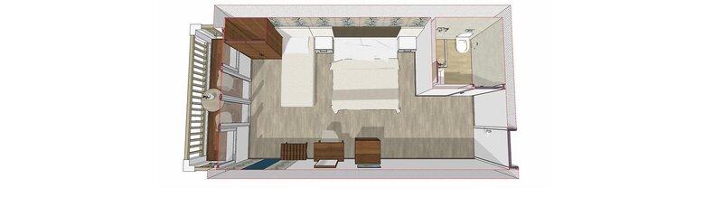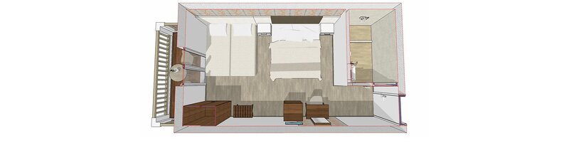 Doppelzimmer (DZM, ca. 15 qm), Klimaanlage, Deckenventilator, Kühlschrank, Kaffee- und Teezubereiter, TV, Telefon, WLAN, Mietsafe. Dusche, WC, Föhn. Balkon, Meerblick. Max. 2E