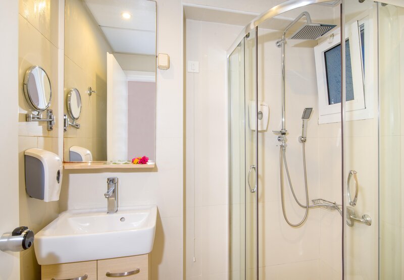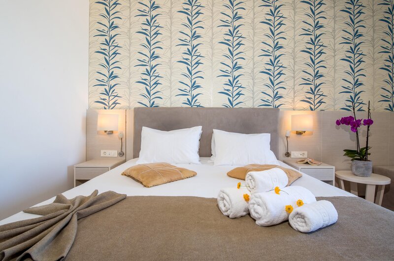 Dvojlôžková izba (DZM, cca 15 m2), klimatizácia, stropný ventilátor, chladnička, kávovar a čajník, TV, telefón, WiFi, prenájom trezoru. Sprcha, WC, fén. balkón, výhľad na more. Maximálne 2E