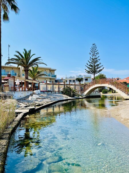 Lage: Direkt am langen Sandstrand von Kalyves, das Zentrum mit kleinen Geschäften und Tavernen ist zu Fuß erreichbar, Chania ist ca. 16 km entfernt. Bushaltestelle in der Nähe.