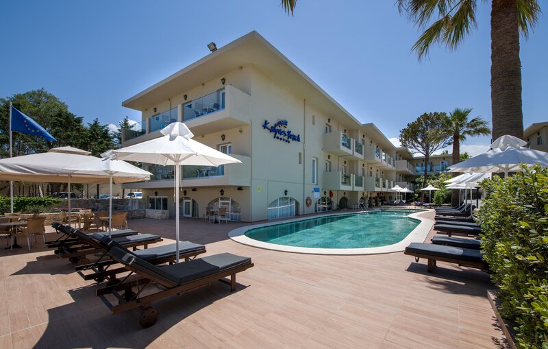 Vybavenie: Hotel sa rozprestiera v 2 budovách. Vo vonkajšom areáli sú 2 bazény, pool/snack bar, ležadlá, slnečníky (pri bazéne a na pláži v cene, plážové osušky za poplatok). Vstupná hala, recepcia, WiFi, spoločenská miestnosť, TV, reštaurácia s terasou. Národná kategória: 4 hviezdičky, 99 izieb, výťah.