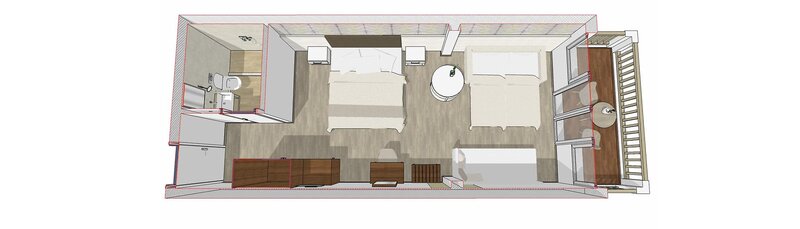 Wohnen: Doppelzimmer (DZ, ca. 15 qm), Klimaanlage, Deckenventilator, Kühlschrank, Kaffee- und Teezubereiter, TV, Telefon, WLAN, Mietsafe. Dusche, WC, Föhn. Balkon, wahlweise seitlicher Meerblick (DSB). Max. 4E